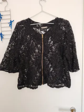 Elegante coprispalle in pizzo nero, perfetto per aggiungere un tocco raffinato al tuo outfit. Presenta una pratica zip frontale. - Tessuto in pizzo lavorato. - Design a manica corta. - Chiusura con zip dorata.
