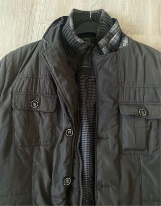 Giubbotto da uomo in colore nero. - Chiusura frontale con zip e bottoni. - Tasche frontali con patta e bottone. - Polsini regolabili con bottoni. - Cappuccio integrato.