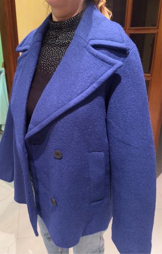 Elegante cappotto Desigual di colore blu. Prezzo Originale 199€. - Design a doppio petto con bottoni. - Ampio colletto a revers. - Tessuto caldo e confortevole.