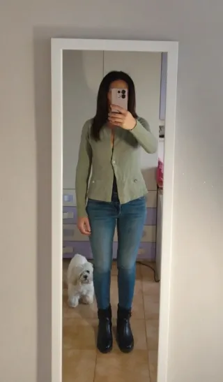 Maglioncino Talco con un bel colore salvia. - Chiusura con bottone. - Tasche frontali. - Morbido e caldo.
