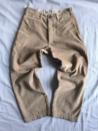 Pantaloni in velluto a coste color beige. - Tessuto in velluto a coste. - Vita con passanti per cintura. - Chiusura con bottone e zip. Piccole macchie interne come da foto.
