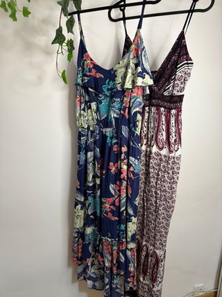 Set di tre abiti in stile Boho Chic con stampe vivaci. Design fluido e confortevole. Spalline regolabili. Lunghezza maxi.