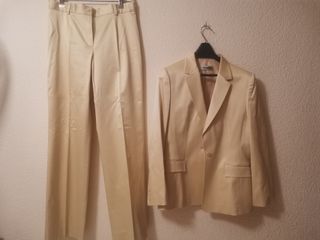 Elegant abito in giacca e pantaloni dal taglio classico color champagne/oro di El Corte Inglés. Indossato una sola volta il giorno della prima e pulito in tintoria. Taglia M. Abito da festa composto da gonna e giacca della boutique Carmen Durán. Indossato meno di 10 volte. Taglia M. + abito rosso con frange + top nero El Corte Inglés taglia P.