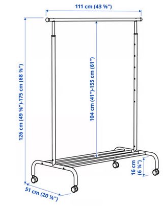 Porta abiti metallico con ruote, ideale per organizzare i tuoi vestiti. - Larghezza: 111 cm - Altezza regolabile: 126 cm - 175 cm - Profondità: 51 cm - Altezza del ripiano inferiore: 16 cm - Gamma di altezza della barra: 104 cm - 155 cm
