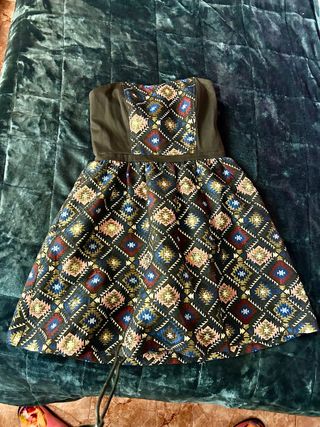 Vestito senza spalline con un vistoso motivo tribale. Design a taglio impero. Parte superiore con dettaglio in tessuto. Gonna con volant.