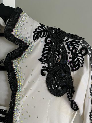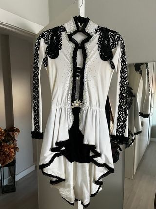 Bellissimo abito da ballo, ideale per competizioni o esposizioni. È un capo elegante e sorprendente. - Design sofisticato con dettagli in bianco e nero. - Realizzato con lycra bianca di alta qualità. - Decorato con cristallo swasorqui