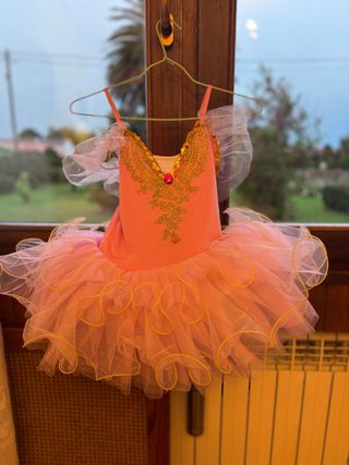 Abito da danza classica con dettagli dorati e strass. - Tutù in tulle a strati - Ornamenti dorati sul corpetto. - Dettaglio in strass rossi al centro. - Maniche in tulle. taglia 8-10 anni