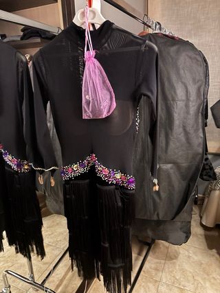 Abito da ballo professionale con dettagli sorprendenti. Fatto a mano. Dettagliato. - Design con strass e frange. - Bretelle sottili sul retro. - Include calze a rete. - Scarpe con tacco alto abbinate.
