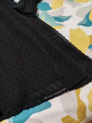 Elegante abito nero con un delicato motivo a pois. Ideale per eventi speciali. - Design con volant sulla scollatura. - Maniche lunghe a sbuffo con dettaglio a balze. - Cintura elastica per una vestibilità comoda. - Tessuto leggero e soffice.