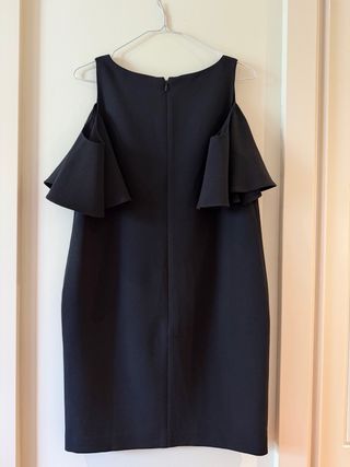 Elegante abito da cocktail nero dal design moderno. - Taglio asimmetrico con spalle scoperte. - Maniche voluminose con volant. - Silhouette dritta e lusinghiera.
