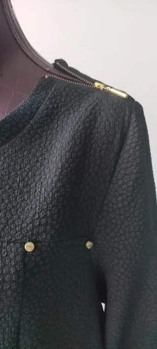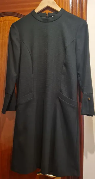 Elegante abito nero, ideale per eventi o cocktail. Presenta un design sofisticato con maniche a tre quarti. - Collo alto - Tasche frontali. - Polsini con bottoni dorati. - Cerniera sul retro.