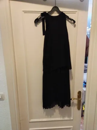 Vestito nero con spalline sottili e un design a volant a cascata. (Clicca sulle foto per vederle intere)Prezioso, elegante, giovane, corto, scollo a V, si adatta al corpo, ha un nastro sotto il seno e tutto il vestito ha dei piccoli volant con 2 texture diverse. Taglia S, 36. Marca Efaces. Misura 81 cm dal collo, e vita vedere le foto, è elastico quindi si allarga. All'interno ha una combinazione, ottima fattura. Composizione 95% poliestere e 5% elastan. Vestito per cerimonia, festa, cocktail, matrimonio, serate... ecc. Usato solo una volta.Pu