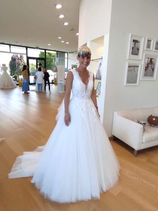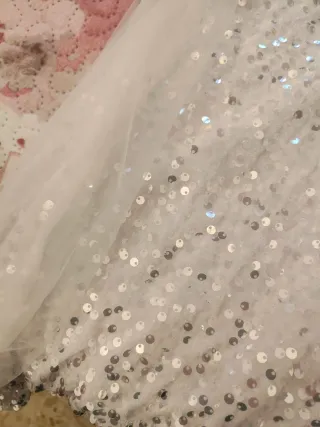Vestito da sposa in stile principessa, con dettagli di paillettes e tulle. - Corpetto con scollo a cuore. - Gonna voluminosa con diverse strati di tulle. - Adoramenti di paillettes e ricami. Il vestito è nuovo, la sposa non si è sposata, è nella scatola. Include anche il cancán. Taglia 36/38. Nelle foto non è indossato il cancán.