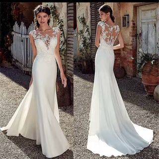 Vestito da sposa elegante con dettagli in pizzo. Design con spalline sottili. Vestibilità sirena. Scollo a V. Imbottitura al petto. Il rivestimento inferiore è leggermente attaccato dal giorno del matrimonio, ma non si nota. Taglia tra 36/38, altezza 163 (indossato con scarpe da 7 cm). Non si consumano, se si vuole dare forma è opzionale ma non necessario. Acquistato in un negozio di abiti da sposa a Parla.