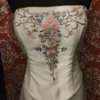 Abito da sposa di design nazionale, taglia 42. Un modello elegante con dettagli ricamati. Abito T42 color avorio di designer nazionale in taffetà di lusso e tulle di seta con ricamo floreale a colori. Molto speciale ed esclusivo. Nuovo in liquidazione da negozio di abiti da sposa ed eventi. Prezzo liquidazione 290€ - Scollo a barchetta. - Gonna lunga e fluida. - Ricami floreali sul corpetto e sottogonna.