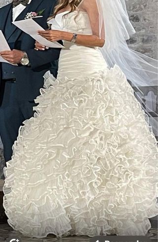 Elegante abito da sposa modello a sirena, perfetto per un giorno speciale. Il design valorizza la figura. - Tessuto in pizzo e tulle. - Scollatura a cuore. - Lungo strascico. utilizzato solo il giorno del matrimonio poi portato subito in lavanderia specializzata in lavaggio per abiti da sposa e riposto nella sua custodia eventualmente regalo la scatola comprata per conservare l'abito se non appeso . misure abito circonferenza seno 83 cm vita 63 cm fianchi 90 altezza mia 1.65 indossato con scarpe con tacco 10 cm in privato se necessario altre foto e video testimonianza prima e dopo il lavaggio