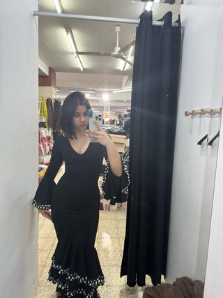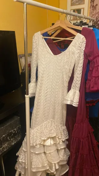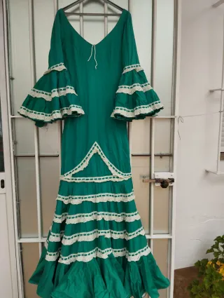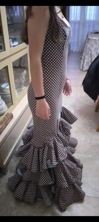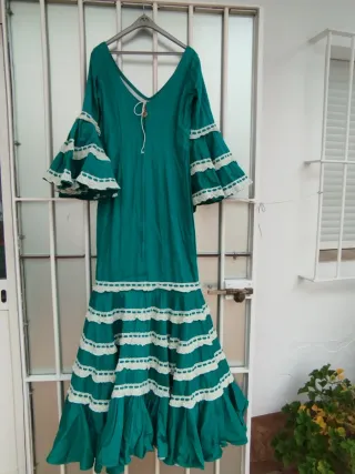 Abito Flamenco su misura in perfetto stato. Con scollatura. Un solo volant e un altro nero in basso (visibile nelle foto), con tasca interna. Taglia S-M. Misure: vita 70 cm, fianchi 96 cm, petto 90 cm, lunghezza 143 cm. Per ulteriori informazioni, contattami 😊