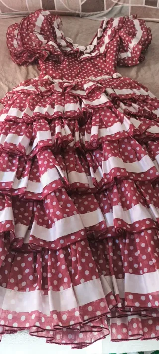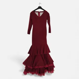 Abito flamenco realizzato da una sarta. - Corpo principale in bordeaux con stampa. - Gonna con volant a cascata. - Dettaglio floreale nella parte inferiore della gonna. - Taglia tra la 34 e la 36. - Ha una tasca sotto i volant. - Tutti i volant sono foderati.