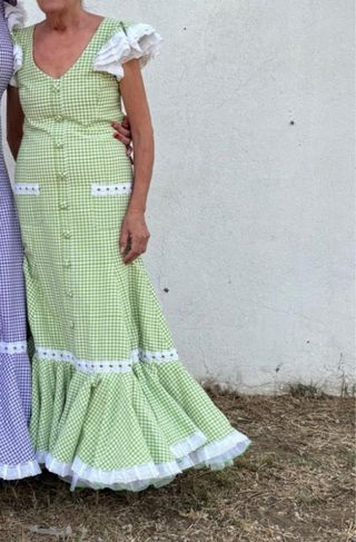 Abito flamenco con un design a quadri. Maniche con volant di striscia ricamata. Dettaglio in pizzo su tasche e fondo. Chiusura con finti bottoni.