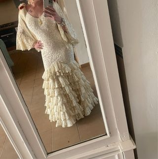 Abito flamenco in due pezzi (ha tessuto per adattare la taglia). Corpo con maniche lunghe in tessuto trasparente e gonna lunga con volant e pizzo. Ha un piccolo foro nel tulle.
