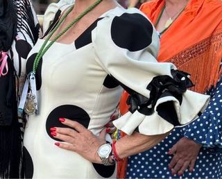Abito flamenco monouso, realizzato in tessuto bielastico. Design a pois. Maniche svasate con volant e carrucce. Abito flamenco in perfetto stato, indossato solo una volta. Taglie tra 38 e 42, con possibilità di regolare o allargare se necessario. Gonna con tasca con cerniera, altezza 1,60. I volant inferiori possono sempre essere abbassati. Dettaglio carrucce sul fondo della gonna e sulle maniche. Scollo quadrato sul davanti e sulla schiena, tessuto bielastico con fodera completa in lycra. Misure appross.: Cintura 72 cm, Fianchi 100 cm, Spalla 50 cm, Petto 82 cm.