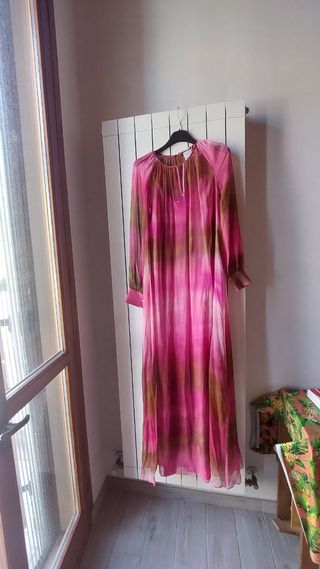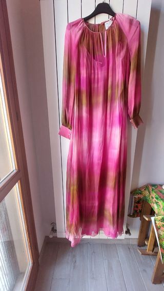 Bellissimo abito lungo in seta, con una stampa sfumata rosa e marrone. Un capo elegante e leggero, perfetto per le occasioni speciali. - Vestibilità comoda e fluida - Lunghezza maxi - Maniche lunghe con polsini Nuovo senza cartellino ma etichetta identificativa Max Mara Studio. Con sottoveste misto seta. Taglia 42 italiana, eccellente vestibilità: distanza ascelle circa 56 cm , a circa 50 cm in basso partendo dal collo alto circa 71 cm di larghezza , a circa 70 cm verso il basso partendo dal collo alto circa 80 cm. Scende dritto ma ricco, ecco perché vestibilità eccellente! È bellissimo