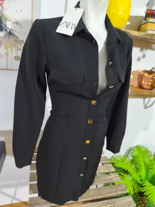 Vestito nero elegante di Zara, con un design che valorizza la figura. Ideale per diverse occasioni. - Chiusura con bottoni dorati. - Tasche frontali con patta. - Collo alla camicia.