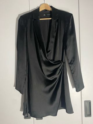 Vestito nero elegante di Zara con design incrociato e dettagli arricciati. - Tessuto satinato. - Manica lunga. - Ajuste con cordoni laterali. - Collo alla francese.