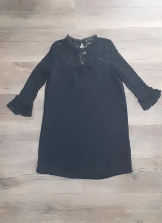 Vestito nero elegante con dettagli in pizzo. - Maniche a 3/4 in pizzo svasate. - Collo alto con dettaglio in pizzo. - Piccola apertura sulla schiena con chiusura a bottone.