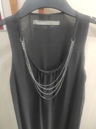 Vestito nero elegante di Zara con dettaglio catena sul collo. Design senza maniche. Catena argentata multistrato. Fondo con finitura ondulata.