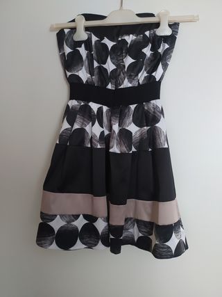Abito corto elegante a pois grandi bianchi e neri, con cinturino nero. Scollatura a cuore. Chiusura dietro a cerniera. Abito elastico sia nella scollatura che alla vita. Misura M. Mai indossato, nuovo, ma senza cartellino. Made in Italy. 90% cotone 10% Elastico. In ottime condizioni e nessun difetto