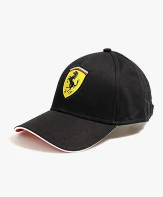 Cappello da baseball con logo Ferrari. - Colore nero. - Patch Scuderia Ferrari sul davanti. - Visiera con bordo rosso e bianco.