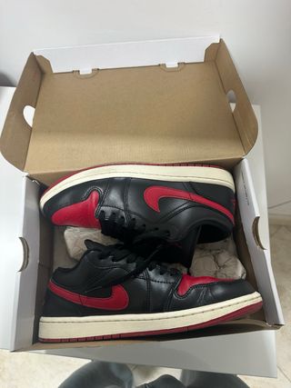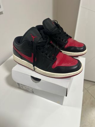 Scarpe Jordan 1 Low. - Tomaia in pelle nera e rossa. - Suola in gomma. - Design iconico.