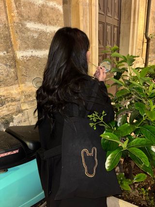 Borsa tote in tessuto nero con un distintivo disegno. - Disegno a forma di mano con corna in filo dorato. - Manici neri. - Tessuto resistente.
