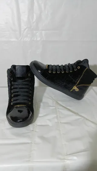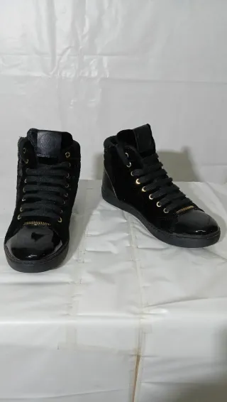 Eleganti sneakers Guess modello stivaletto. - Dettagli in vernice lucida. - Zip laterale dorata. - Lacci neri. - Tessuto velluto e pelle Numero 38