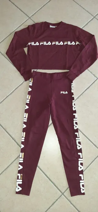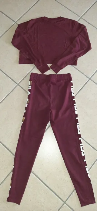 Completo sportivo Fila composto da felpa cropped e leggings. - Felpa con logo Fila stampato sul davanti taglia M - Leggings con banda laterale logata Fila taglia S - Colore bordeaux con dettagli oro.