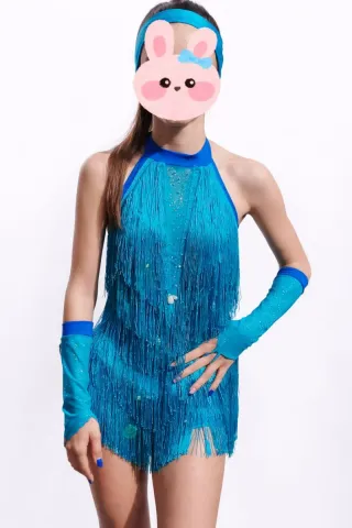 Abito da ballo latino sartoriale, realizzato con cura artigianale. - Dettagli con frange scintillanti. - Tessuto elasticizzato per massima libertà di movimento. - Completo di accessori coordinati.