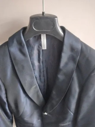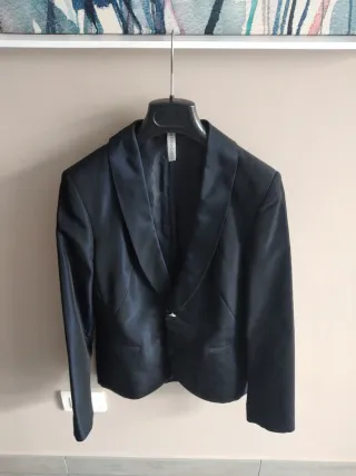 Elegante giacca da donna, perfetta per completare un outfit sofisticato. - Tessuto lucido con finiture. - Chiusura con un bottone. - Tasche frontali a filetto.