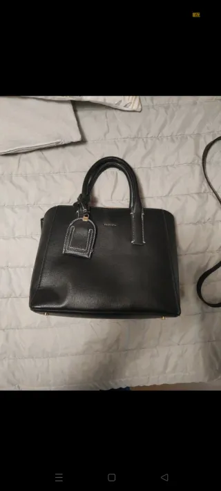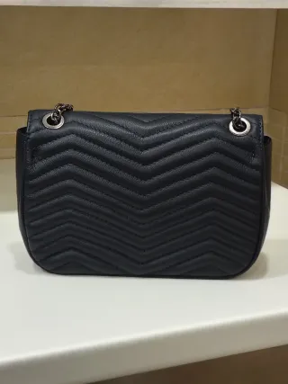 Elegante borsa in pelle nera. - Materiale: pelle martellata. - Dettagli con cuciture a contrasto. - Charm pendente con logo. Dotata di tracolla e alcuni difetti come in foto. Cerniere integre