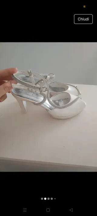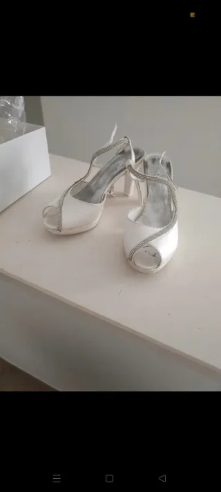 Eleganti scarpe da sposa con dettagli scintillanti. Perfette per il giorno del matrimonio. - Tacco comodo e plateau. - Design open-toe. - Decorazioni con strass lungo i cinturini. Ovviamente usate solo il giorno del matrimonio