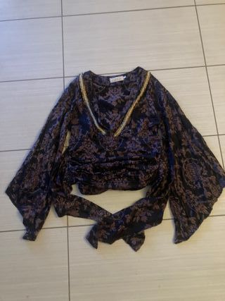 Elegante camicia in seta con un motivo floreale unico. Il design avvolgente e le maniche ampie la rendono un capo versatile. - Tessuto: Seta - Dettagli: Bordatura dorata lungo il collo e la chiusura - Maniche: Lunghe e svasate