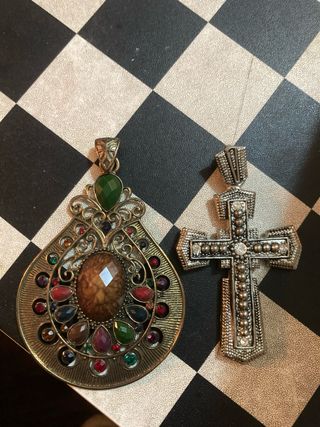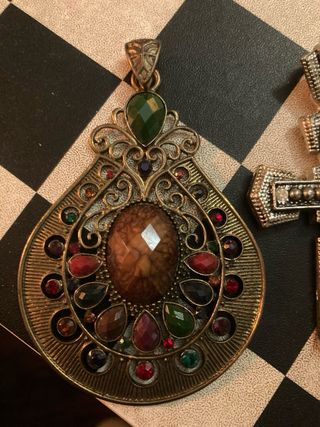 Set di due grandi ciondoli con pietre colorate. - Un ciondolo a forma di goccia con decorazioni elaborate e pietre di varie tonalità. - Un ciondolo a forma di croce con dettagli in rilievo e piccole pietre luminose.