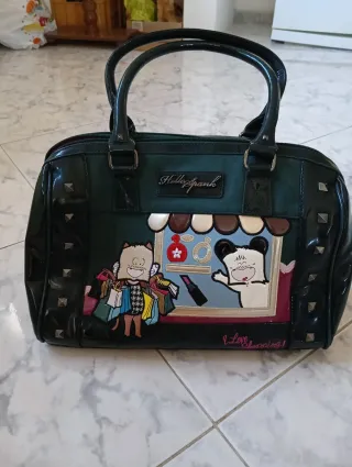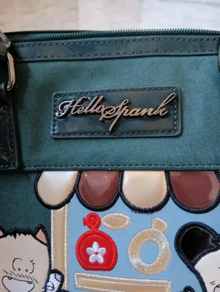 Borsa a mano Hello Spank con un design unico e divertente. - Colore verde scuro con dettagli neri lucidi. - Applicazioni a tema shopping con personaggi. - Borchie decorative sui lati.