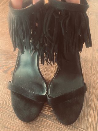 Eleganti sandali neri con un design unico. - Dettagli con frange decorative. - Materiale scamosciato morbido al tatto. - Cinturino alla caviglia per una calzata sicura.