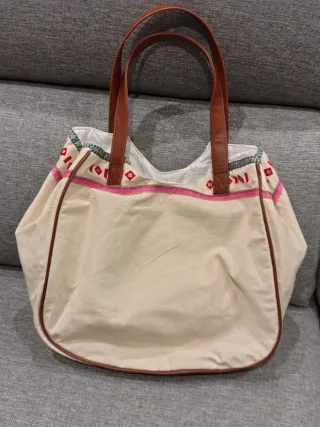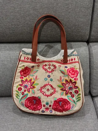 Borsa con un design unico e colorato, perfetta per aggiungere un tocco di stile. - Ricami floreali vivaci. - Dettagli con specchietti e perline. - Manici in ecopelle marrone. - Finiture con bordino marrone ecopelle Chiusura a calamita Interno foderato