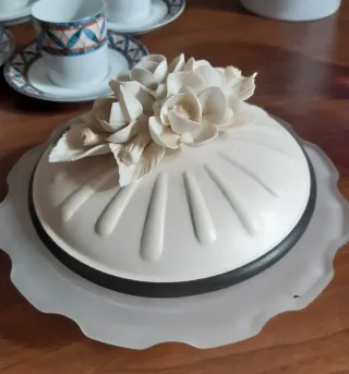 Elegante portagioie in ceramica con decorazioni floreali. - Design raffinato con fiori applicati. - Finitura in ceramica color crema e bianco. - Marchio Via Veneto visibile. Uno dei fiori ha un petalo leggermente danneggiato