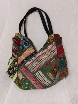 Borsa Antik Batik con un design patchwork unico. - Patchwork di tessuti colorati. - Dettagli ricamati.ricamo centrale in pelle e perline - Manici neri in similpelle robusti Chiusura a calamita Dimensioni grande