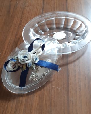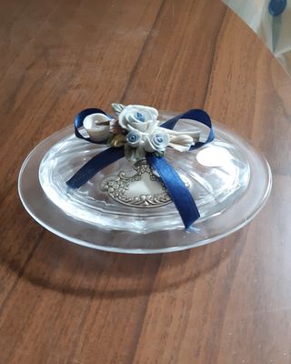 Elegante portagioie in vetro con inserti in argento 925, con decorazioni floreali e nastro blu. - Dettagli: Fiori in ceramica e nastro in raso blu - Design: Ovale con finiture lavorate