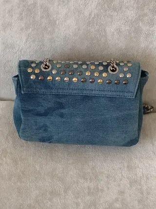 Mini borsa Gio Cellini in denim, arricchita da borchie metalliche. - Design con borchie color argento e oro. - Tracolla a catena e in denim regolabile - Chiusura a patta.20 x 16 profondità 6