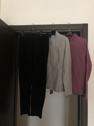 Set composto da un pantalone nero e due felpe, una grigia e una viola. - Pantalone con coulisse. - Felpa grigia con zip. - Felpa rossa con motivo trapuntato.